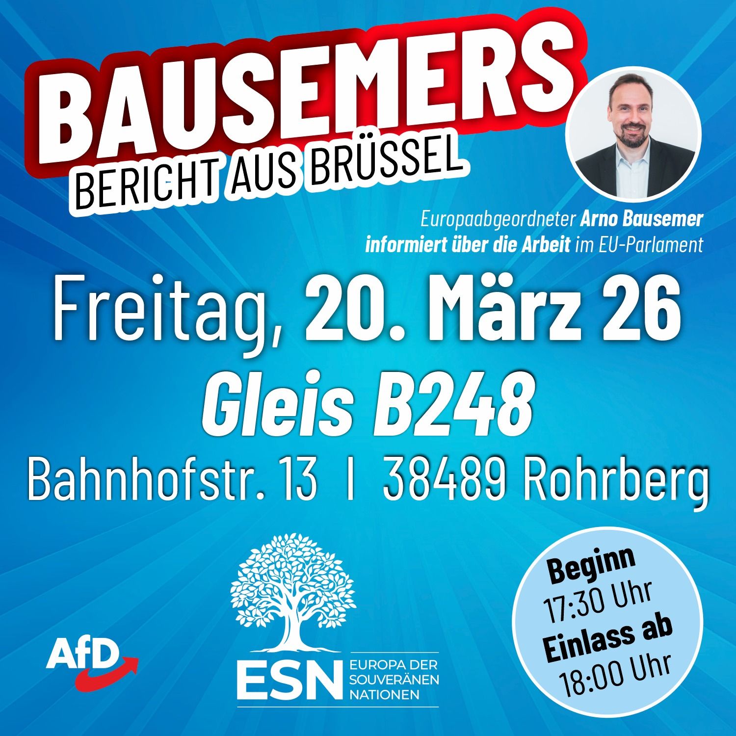 Im Rahmen der Veranstaltungsreihe „Bausemers Bericht aus Brüssel“ lädt der Stendaler AfD-Europaabgeordnete Arno Bausemer am Freitag nach Osterburg ein. Die Informationsveranstaltung in der Gaststätte „Zum Kanzler“ beginnt um 19 Uhr, der Einlass erfolgt bereits ab 18.30 Uhr. In seinem Vortrag wird Bausemer einen Einblick in die Arbeitsweise des EU-Parlaments geben und speziell über seine Mitarbeit in der neugeründeten ESN-Fraktion sowie in den Ausschüssen für Landwirtschaft, Binnenmarkt und Haushaltskontrolle informieren.